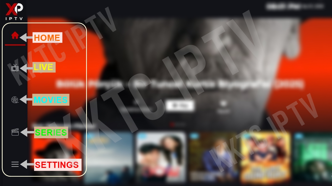 Açılan ekranda sol menüde sırasıyla HOME, LIVE TV, MOVIES, SERIES ve SETTINGS seçeneklerinin resimleri bulunur.